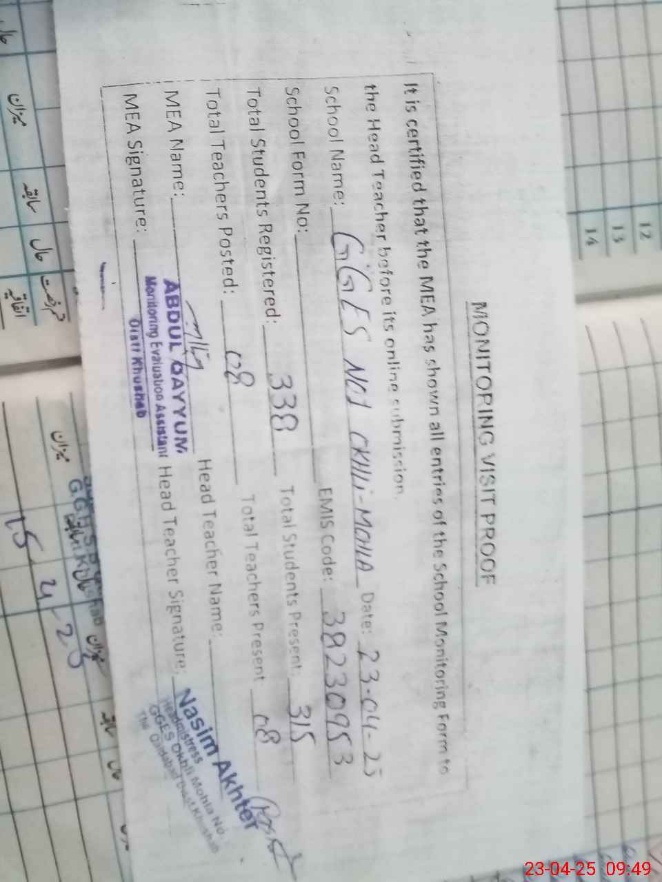 | Attendance Register | Head Teacher | MEA with School | Visit Proof |
