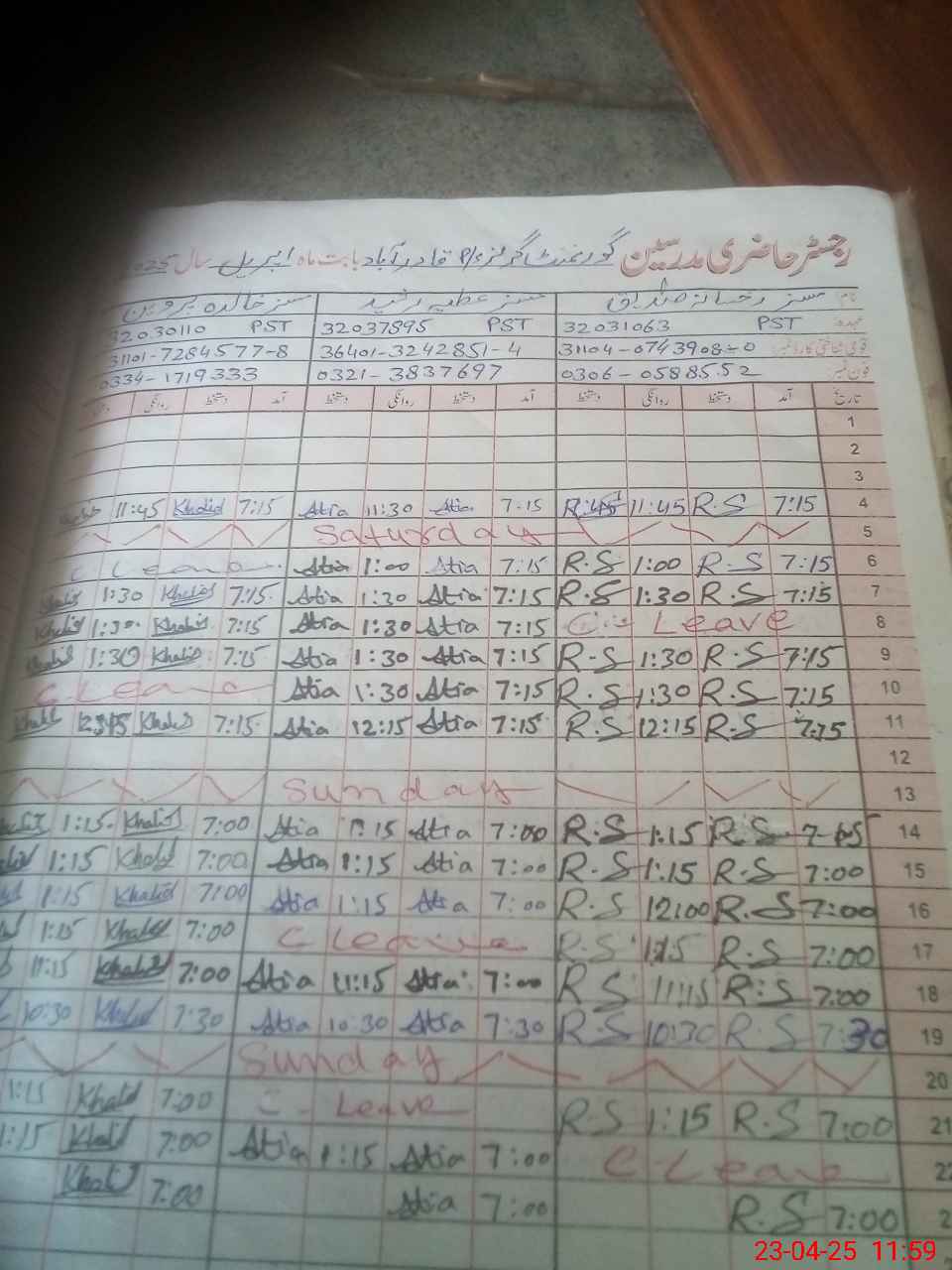 | CNIC | Full Name | Designation | R/C | Absence During Last Calender Month |