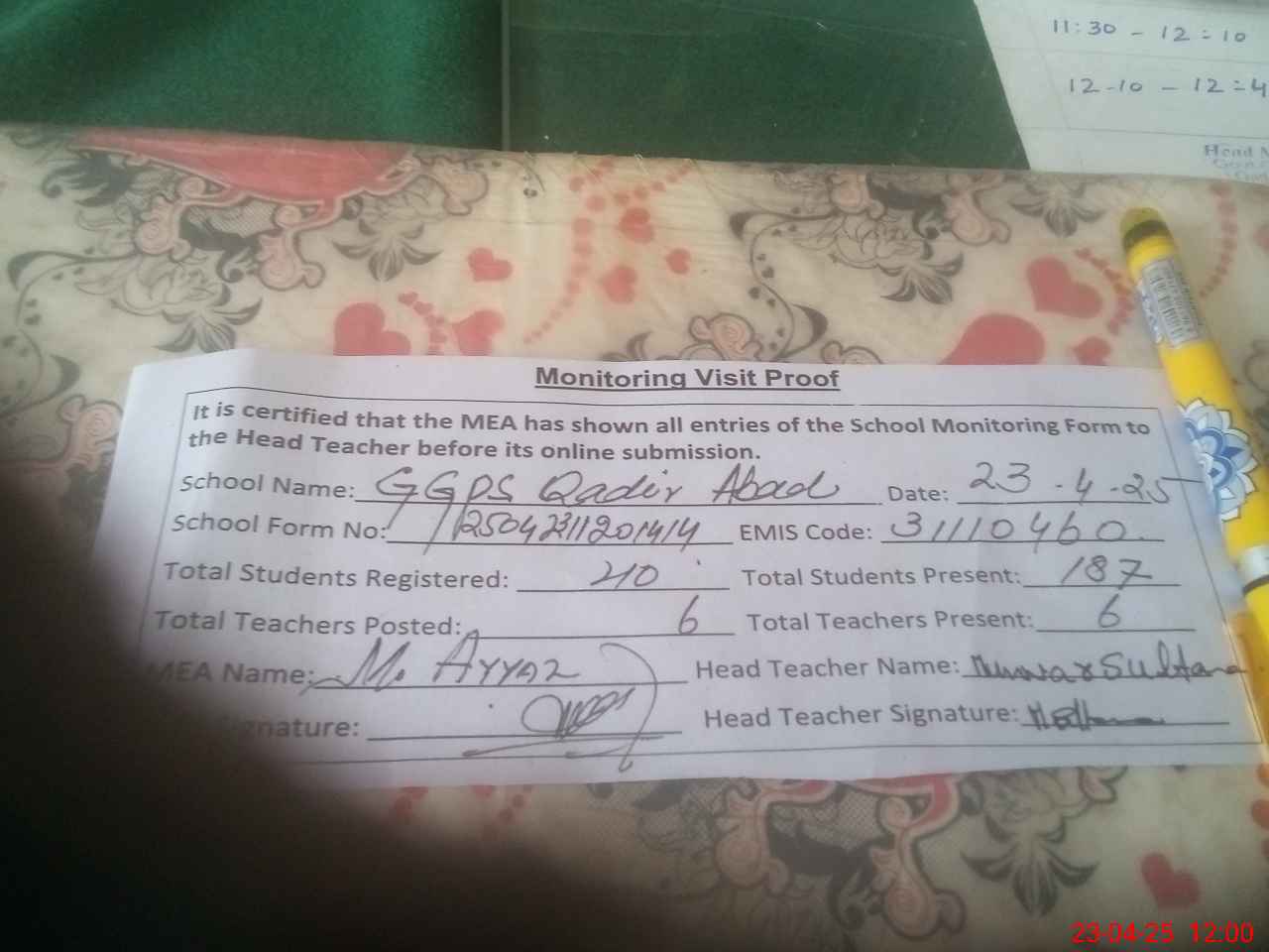 | Attendance Register | Head Teacher | MEA with School | Visit Proof |