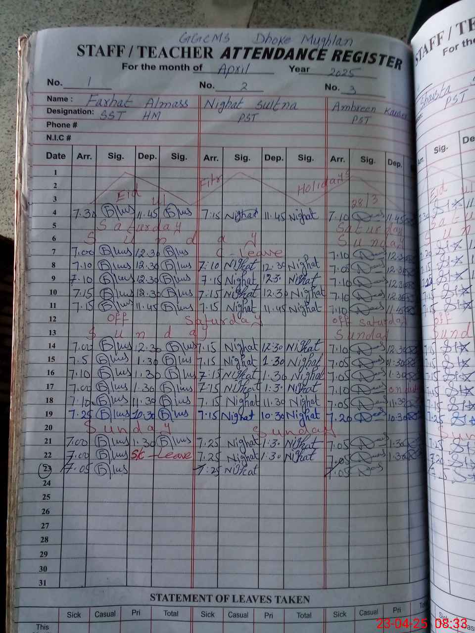 | Leave | Duty | Absent | Maternity | Medical | Ex- Pak |
