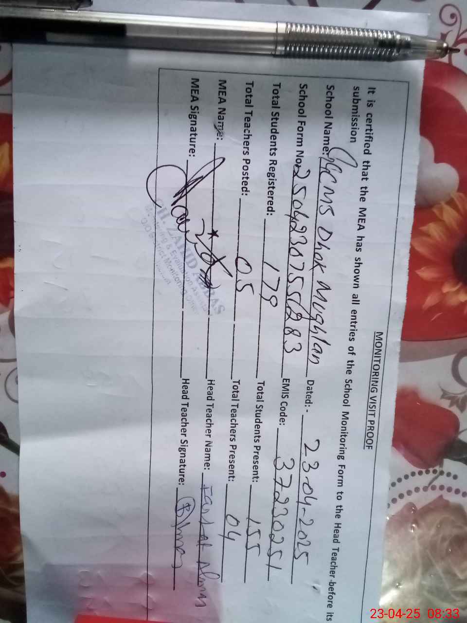 | Attendance Register | Head Teacher | MEA with School | Visit Proof |