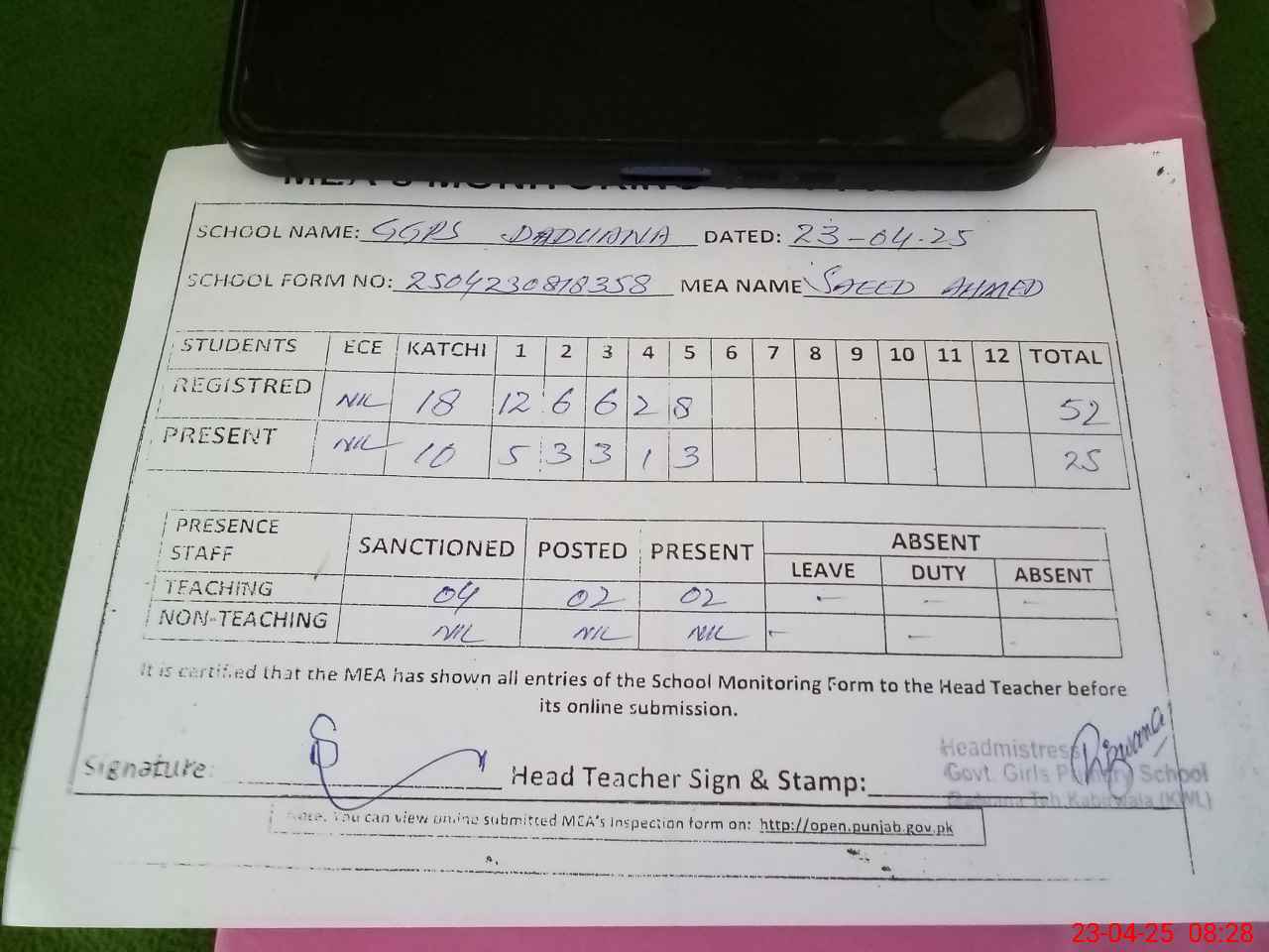 | EMIS Code: 36410434 | Name of School: GGPS DADUANA, SARAI SIDHU | |||