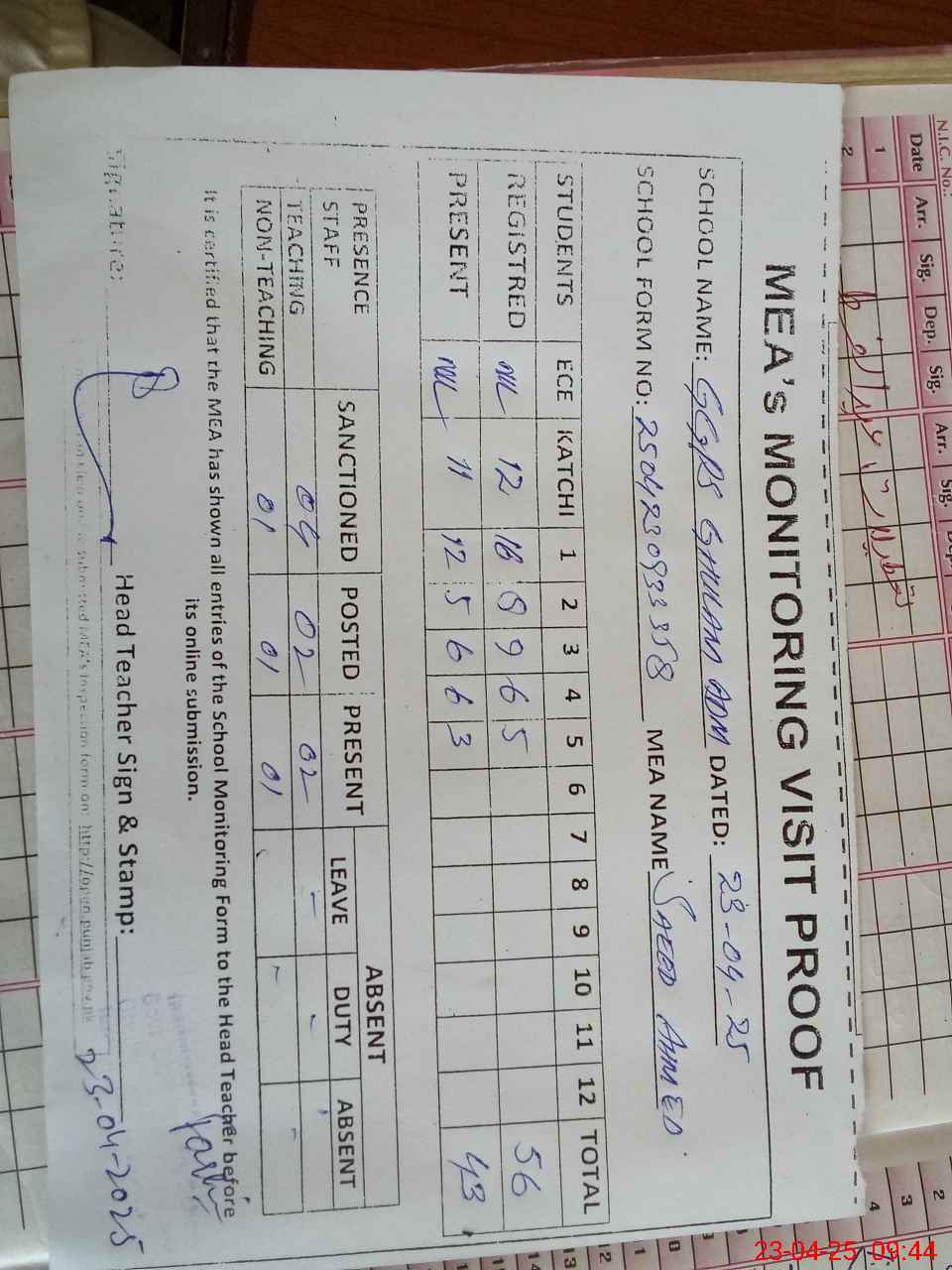 | Attendance Register | Head Teacher | MEA with School | Visit Proof |