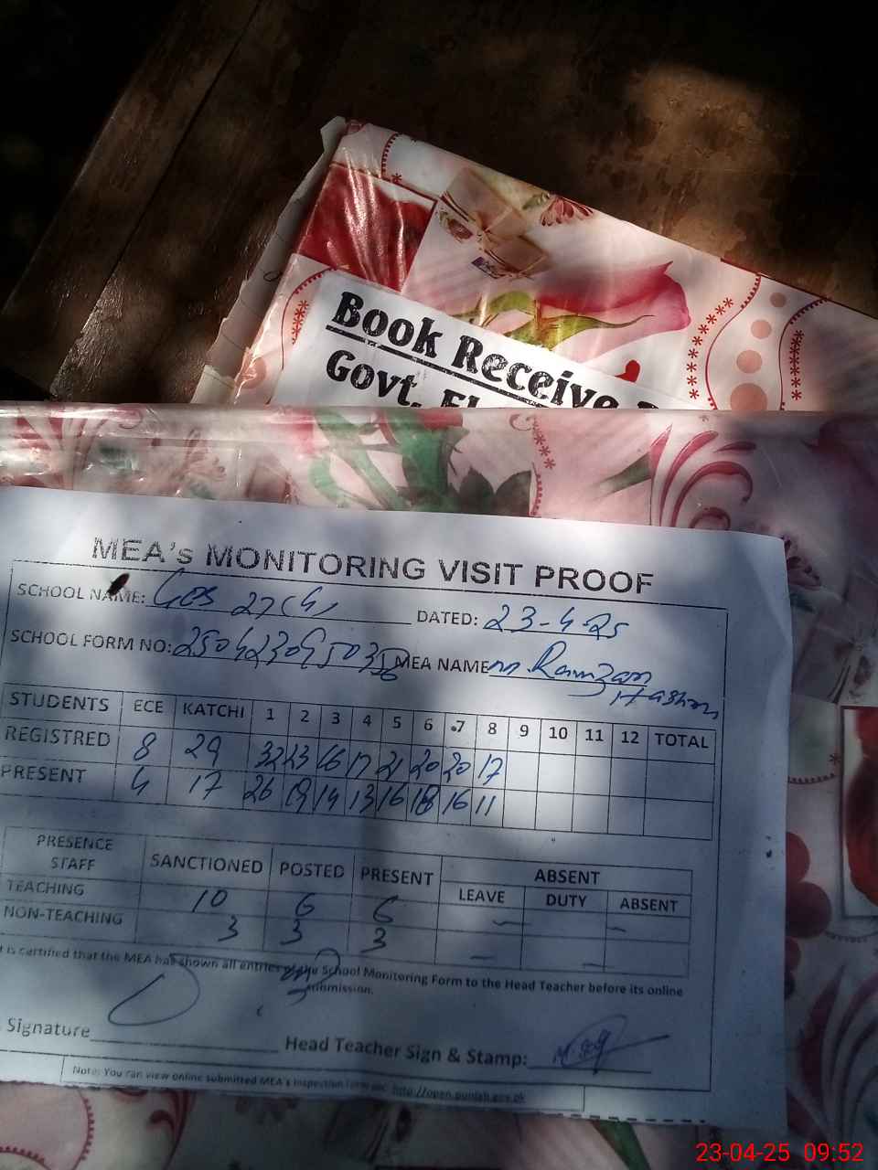 | Attendance Register | Head Teacher | MEA with School | Visit Proof |
