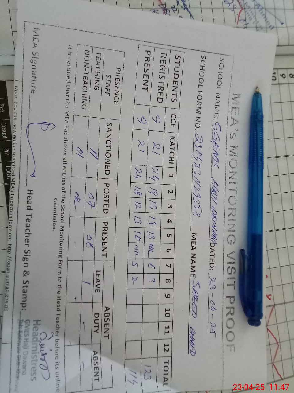 | Attendance Register | Head Teacher | MEA with School | Visit Proof |