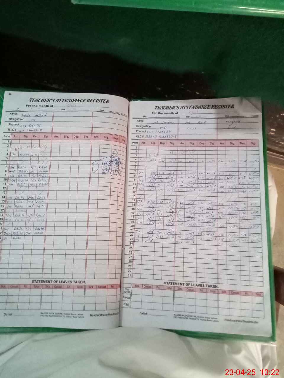 | CNIC | Full Name | Designation | R/C | Absence During Last Calender Month |