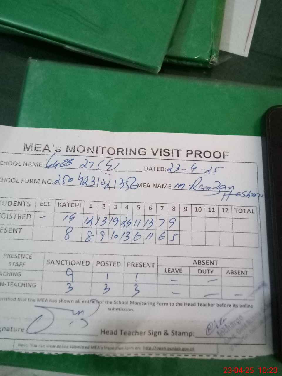 | Attendance Register | Head Teacher | MEA with School | Visit Proof |