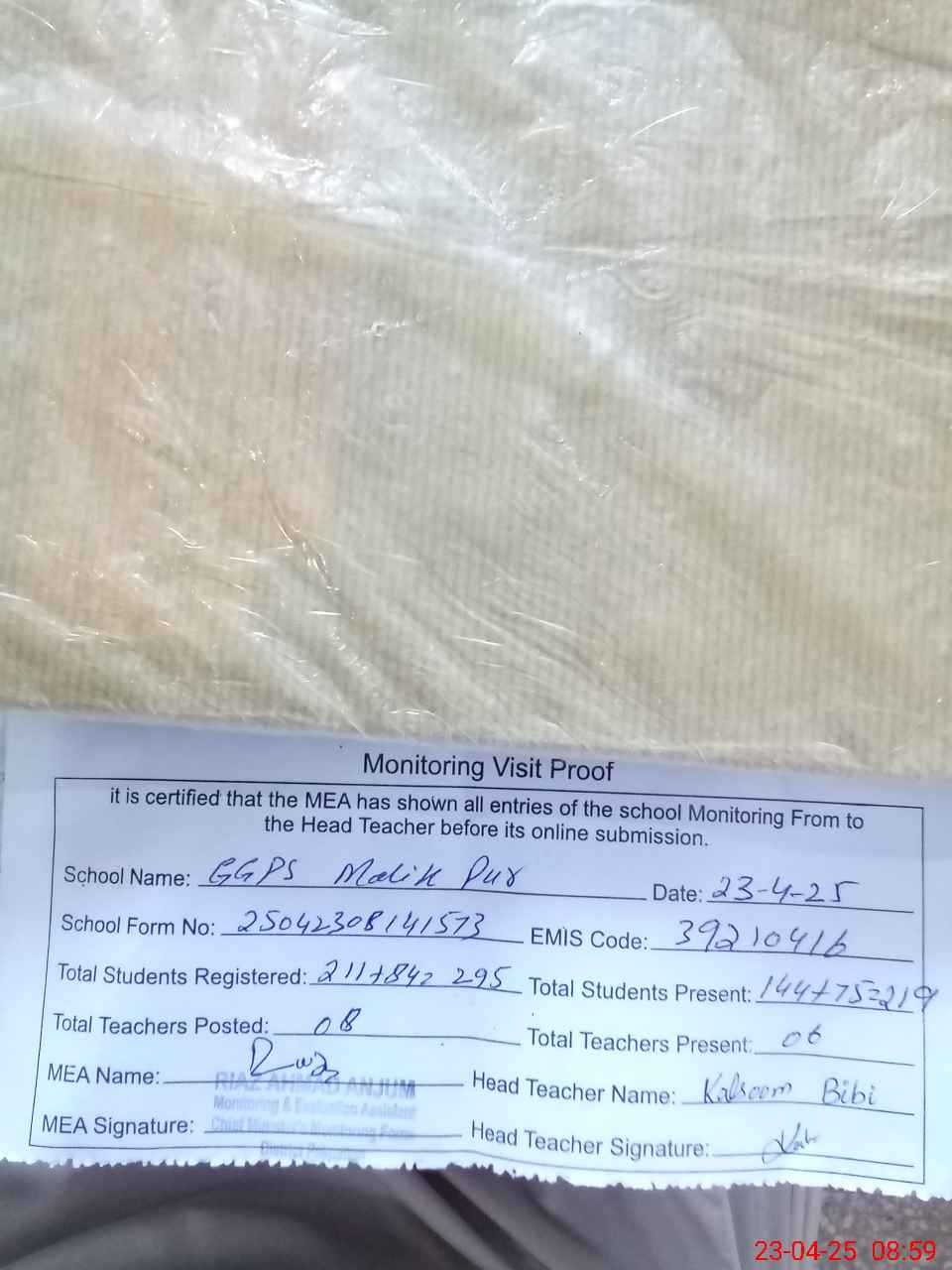 | Attendance Register | Head Teacher | MEA with School | Visit Proof |
