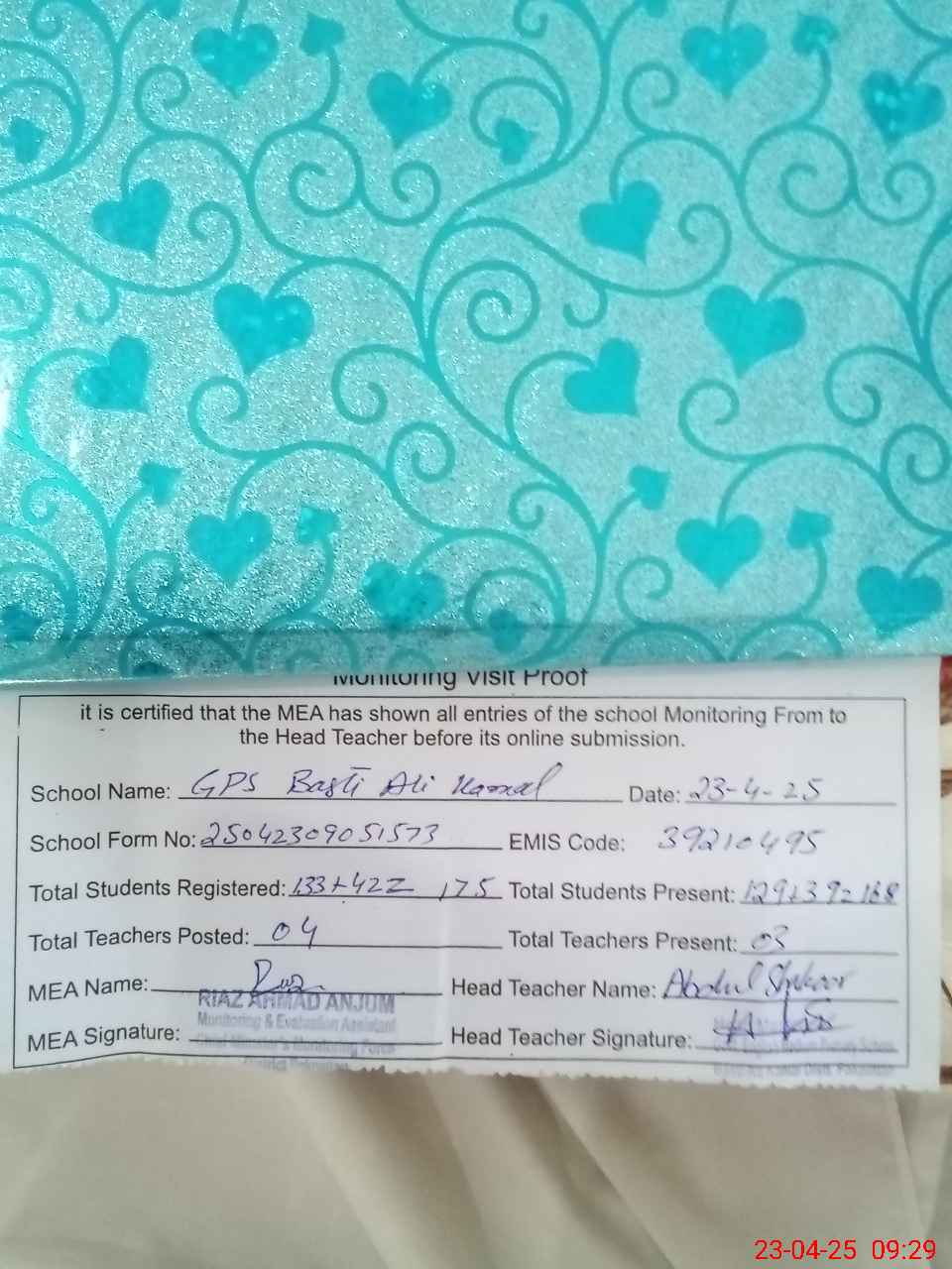 | Attendance Register | Head Teacher | MEA with School | Visit Proof |