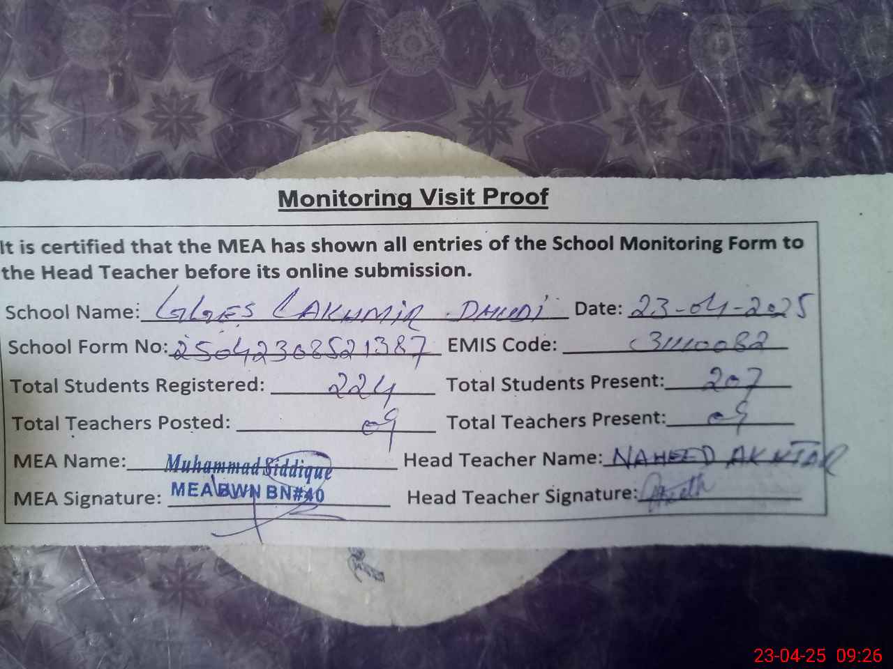 | Certified that this School was Inspected by the Undersigned MEA/DMO Today and the Information Stated Above is as Per Record. | |||||