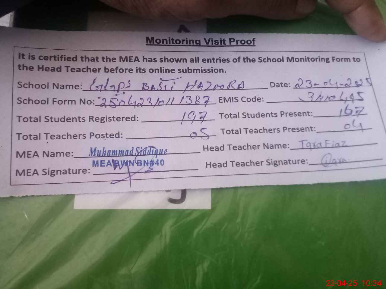 | Attendance Register | Head Teacher | MEA with School | Visit Proof |