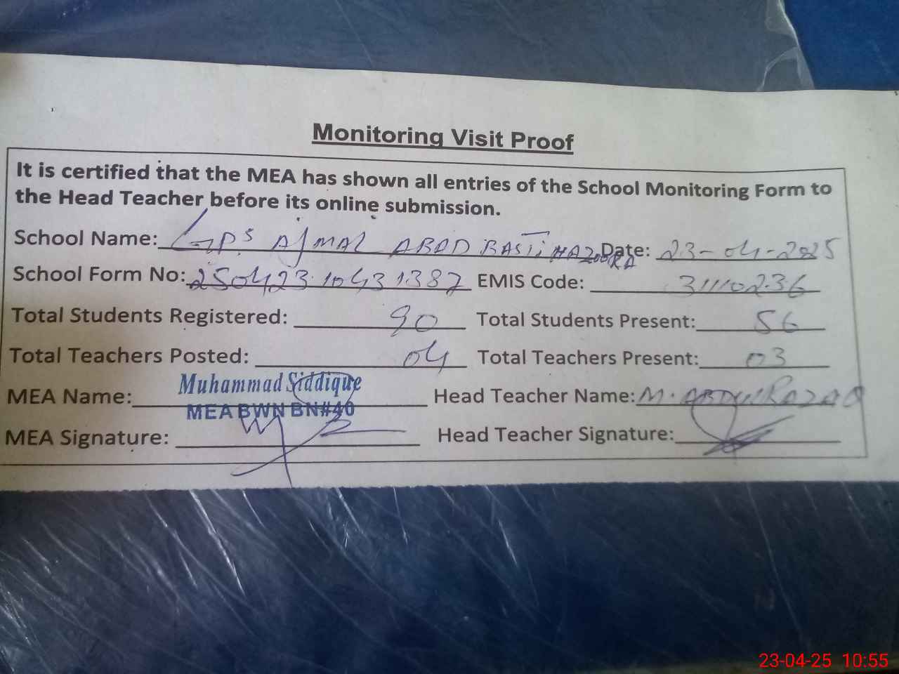 | EMIS Code: 31110236 | Name of School: GPS AJMAL ABAD (BASTI HAZOORA) | |||