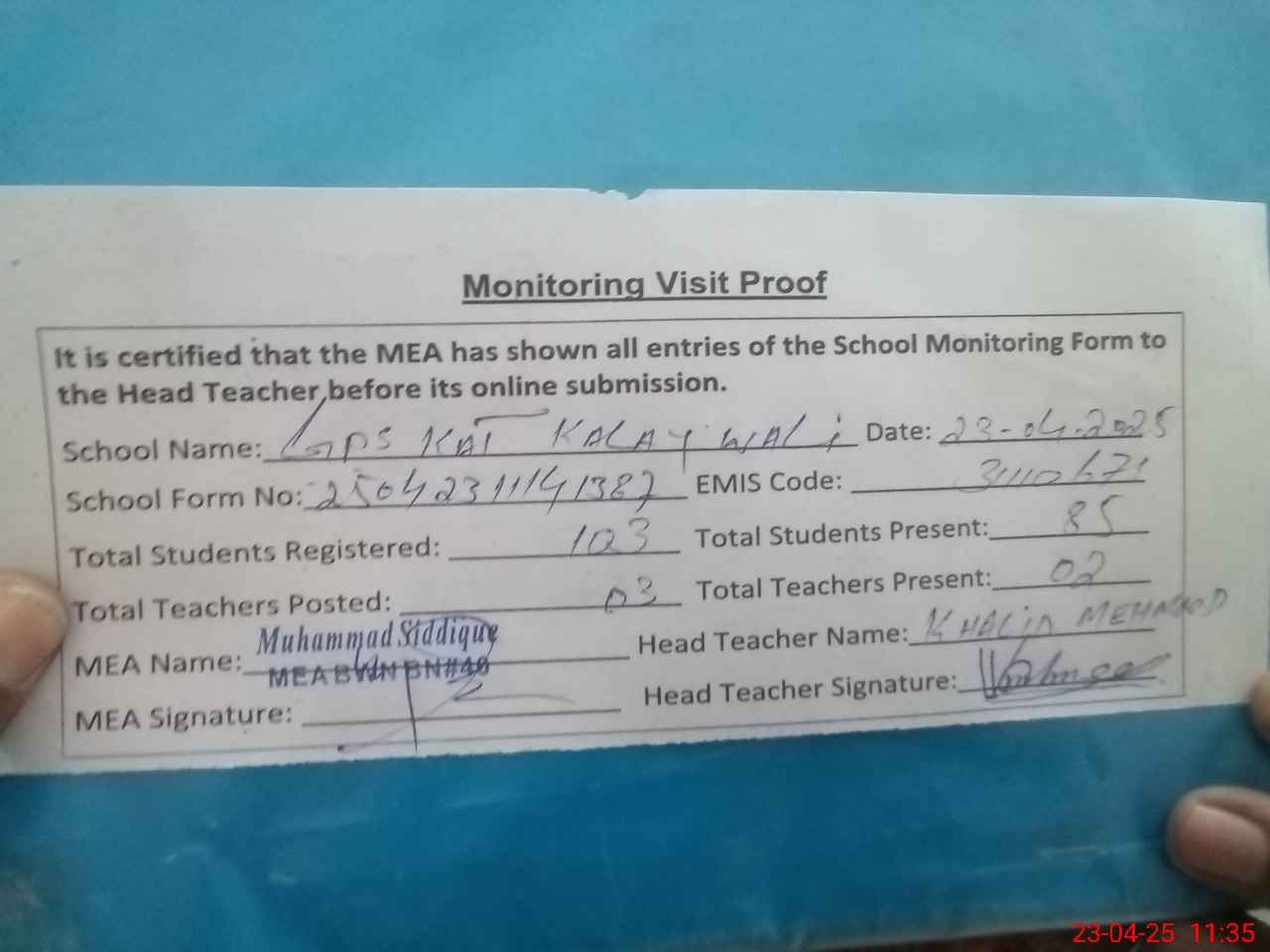 | Attendance Register | Head Teacher | MEA with School | Visit Proof |