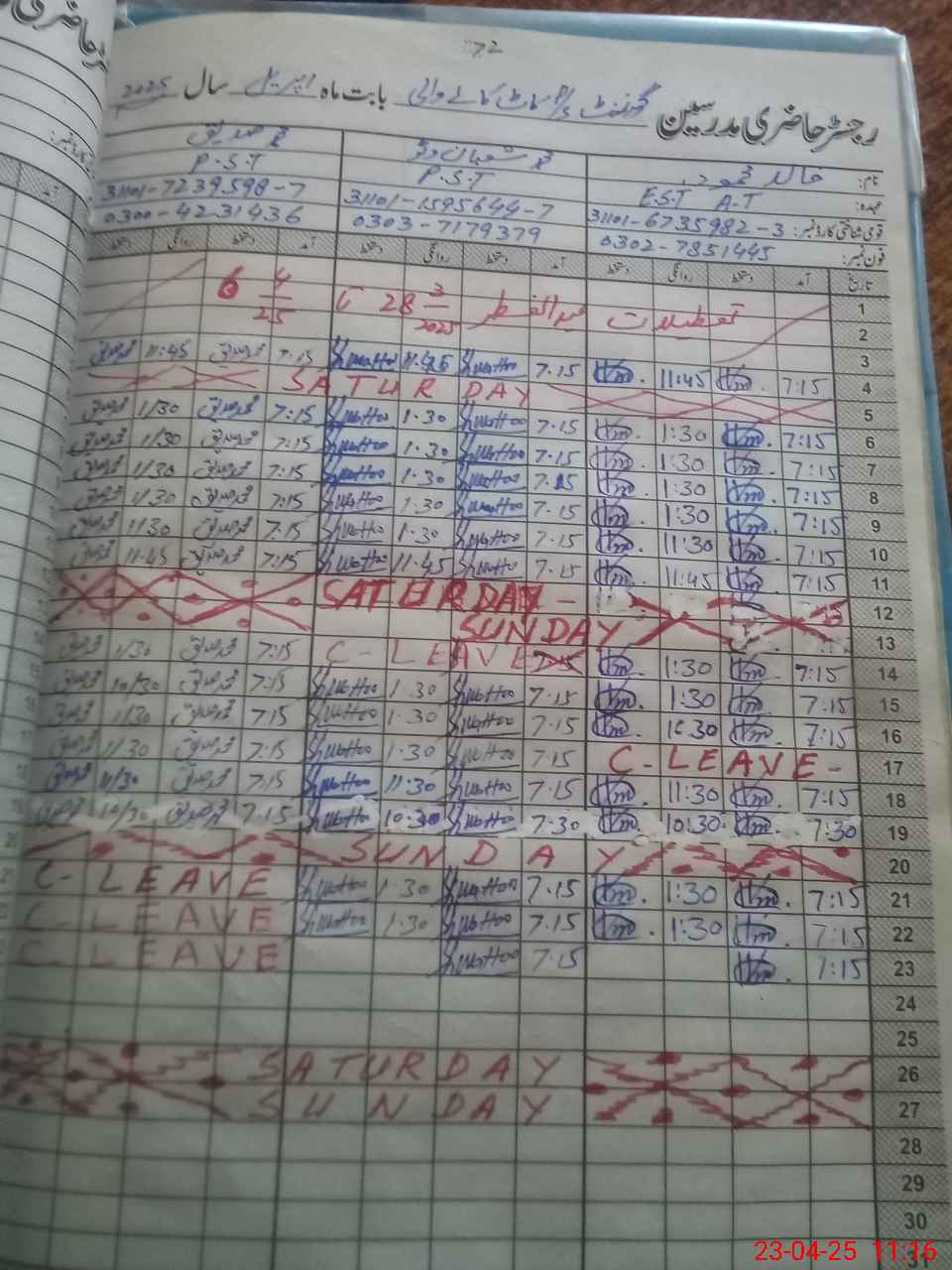 | CNIC | Full Name | Designation | R/C | Absence During Last Calender Month |