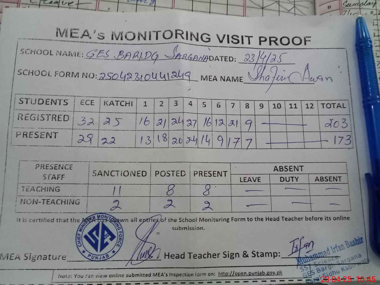 | EMIS Code: 36410063 | Name of School: GES BARJH SARGANA, SARAI SIDHU | |||