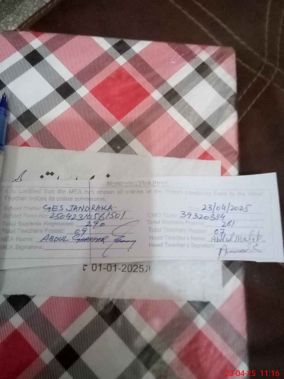 | Attendance Register | Head Teacher | MEA with School | Visit Proof |