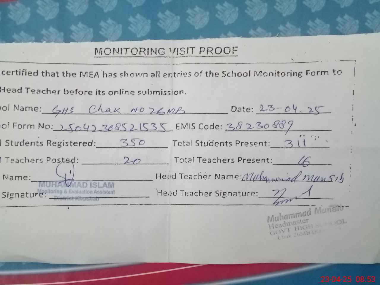 | Attendance Register | Head Teacher | MEA with School | Visit Proof |