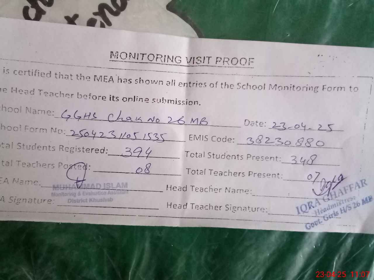| Attendance Register | Head Teacher | MEA with School | Visit Proof |