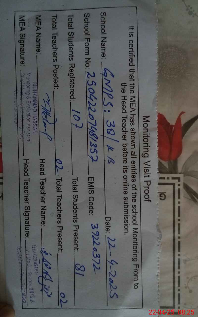 | EMIS Code: 39220372 | Name of School: GMPS CHAK NO 38 KB | |||