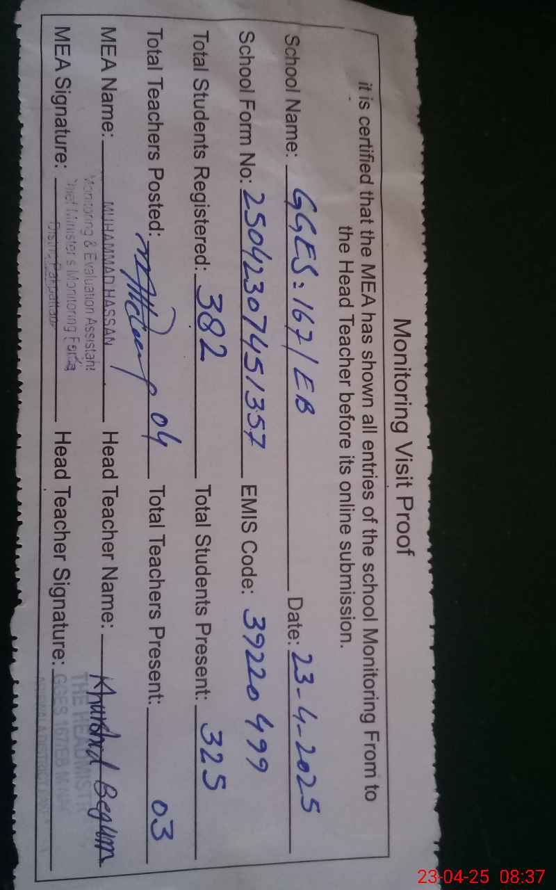 | EMIS Code: 39220499 | Name of School: GGES CHAK NO.167 EB | |||