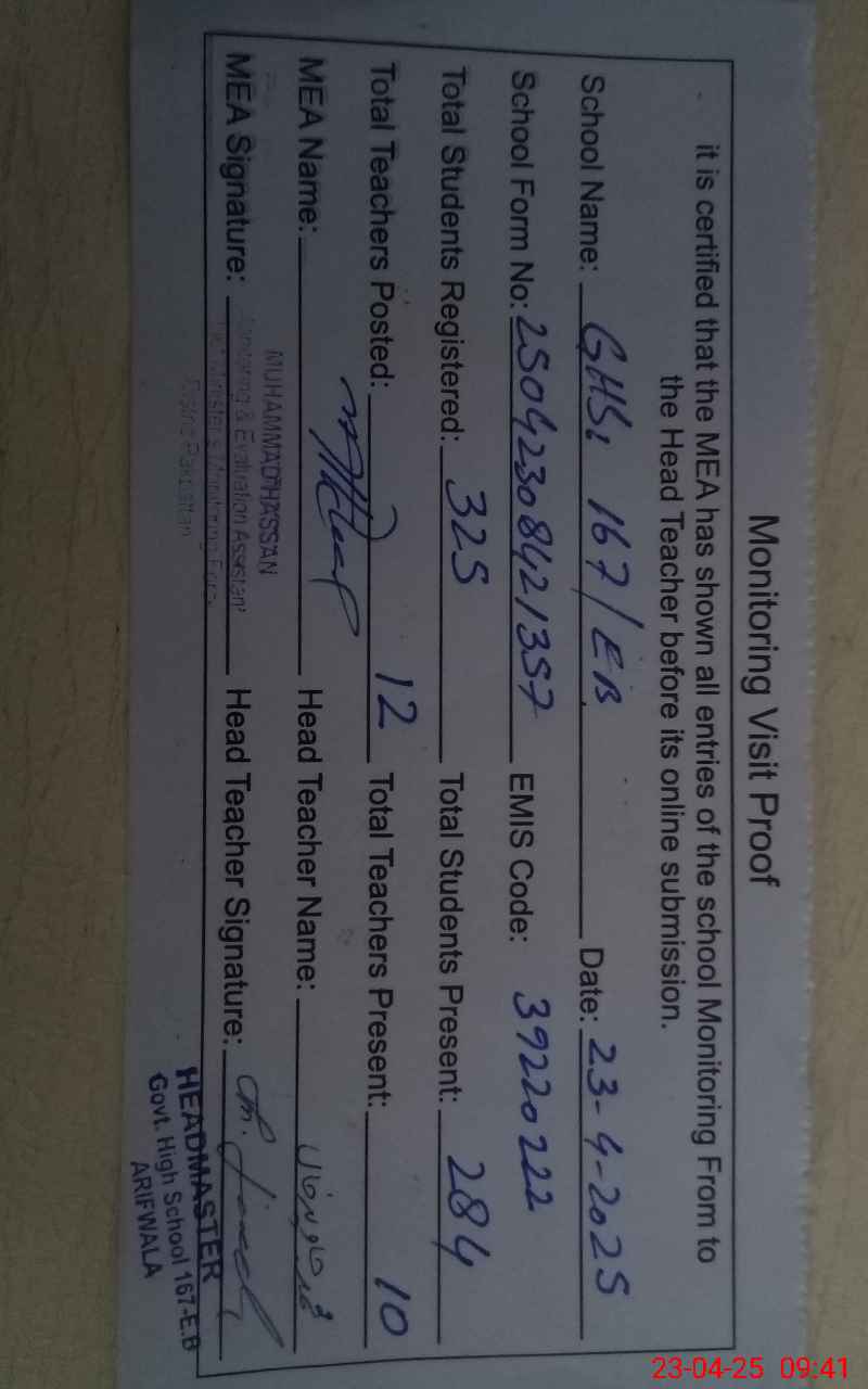 | EMIS Code: 39220222 | Name of School: GHS 167 EB | |||