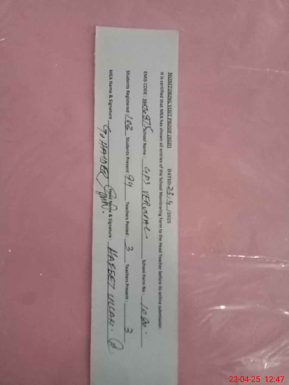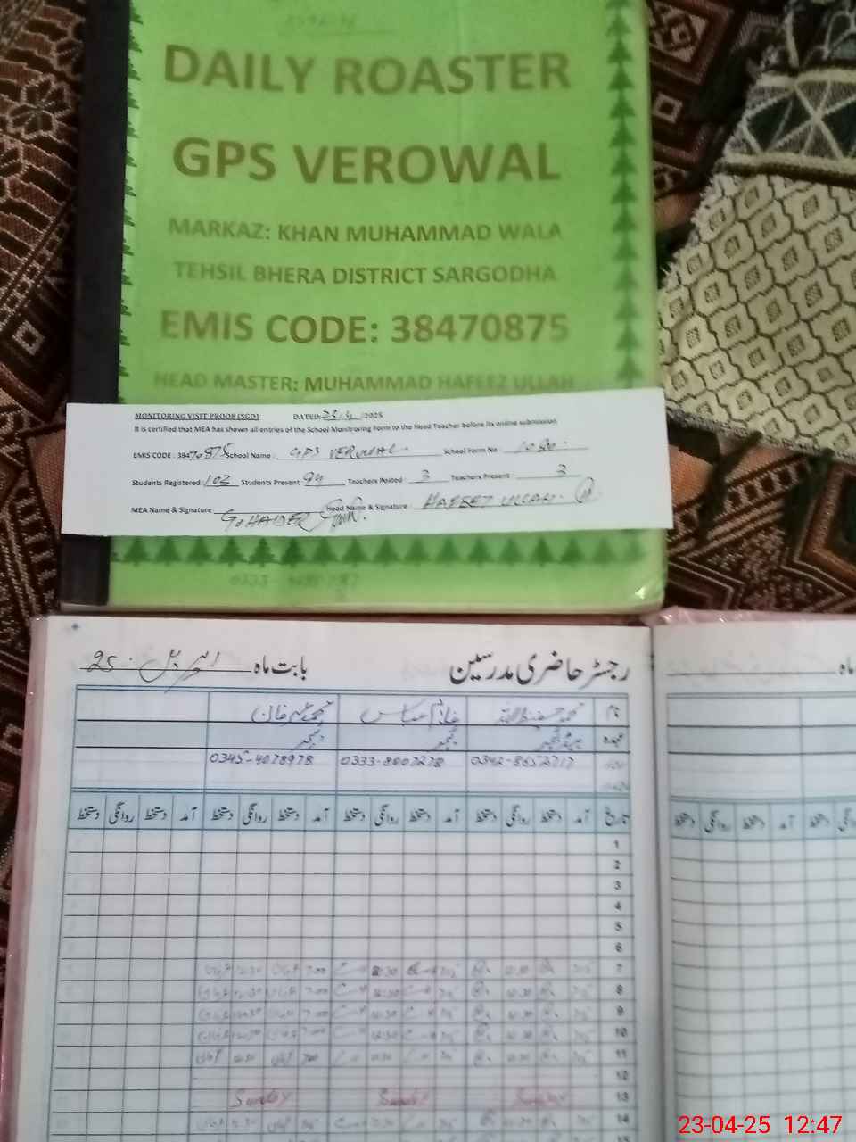 | Attendance Register | Head Teacher | MEA with School | Visit Proof |