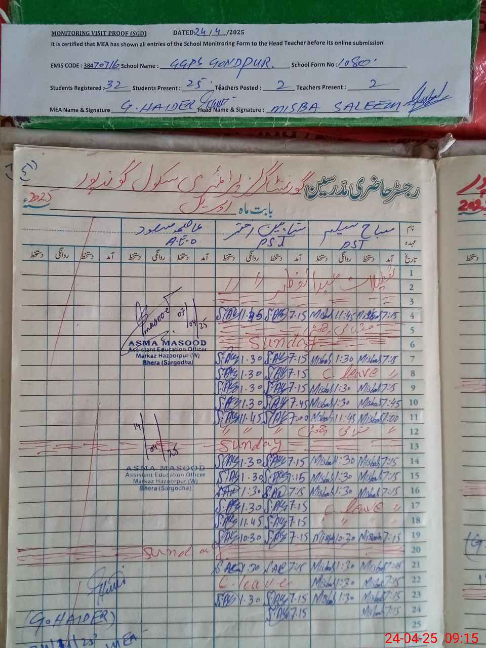 | Attendance Register | Head Teacher | MEA with School | Visit Proof |