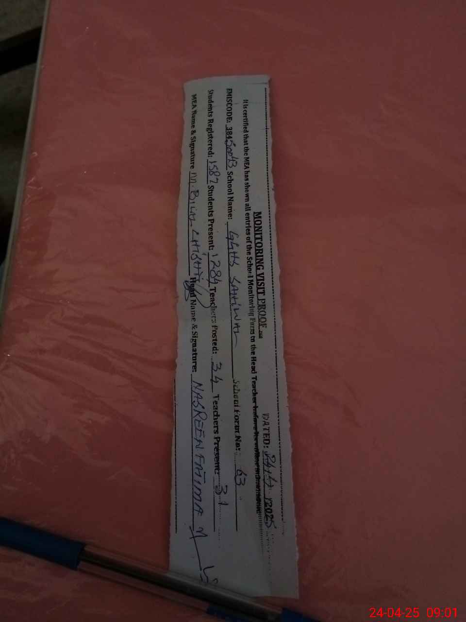 | Attendance Register | Head Teacher | MEA with School | Visit Proof |