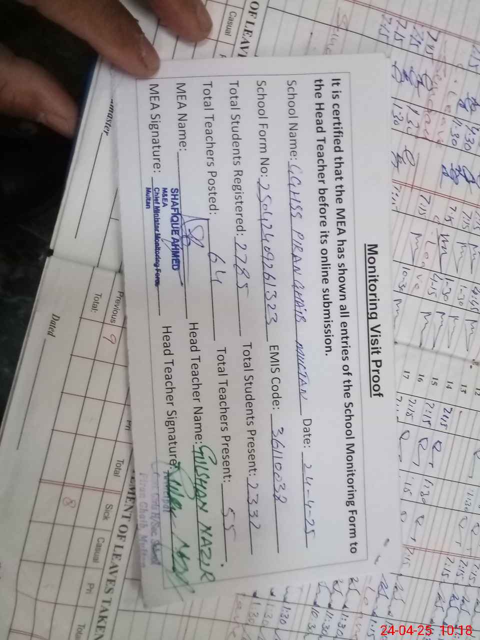 | Attendance Register | Head Teacher | MEA with School | Visit Proof |