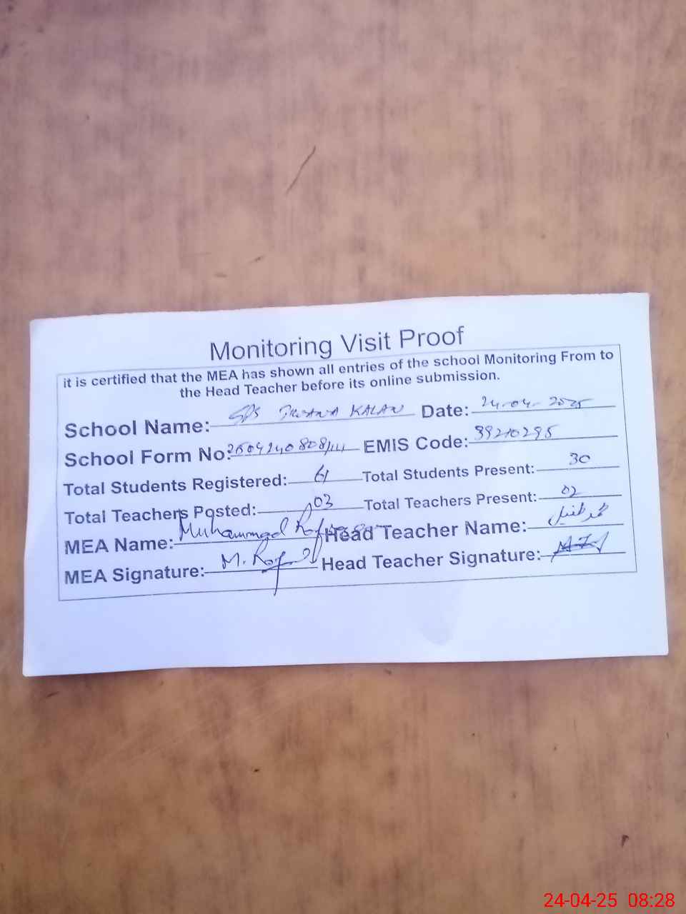 | Attendance Register | Head Teacher | MEA with School | Visit Proof |