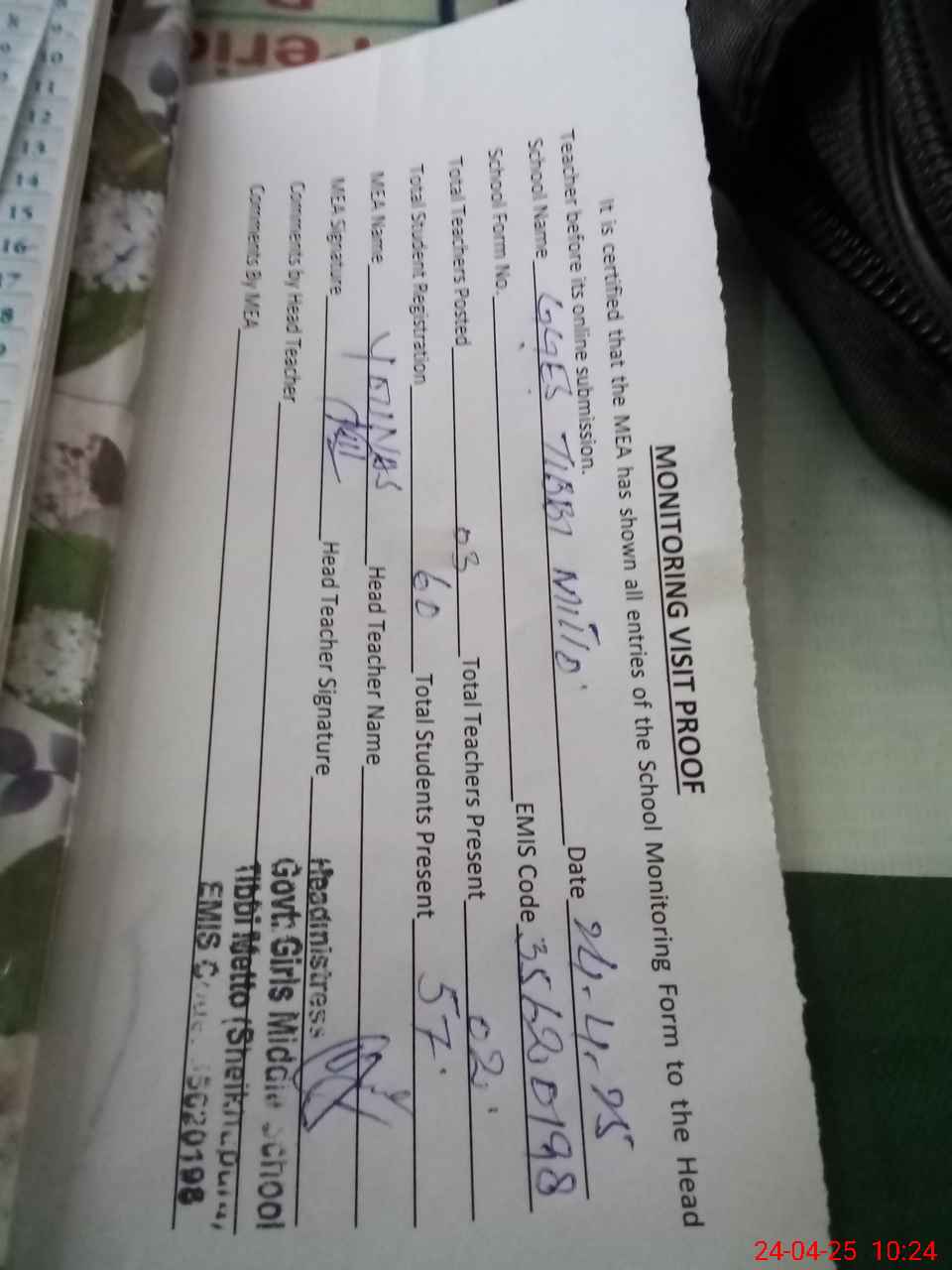| Attendance Register | Head Teacher | MEA with School | Visit Proof |