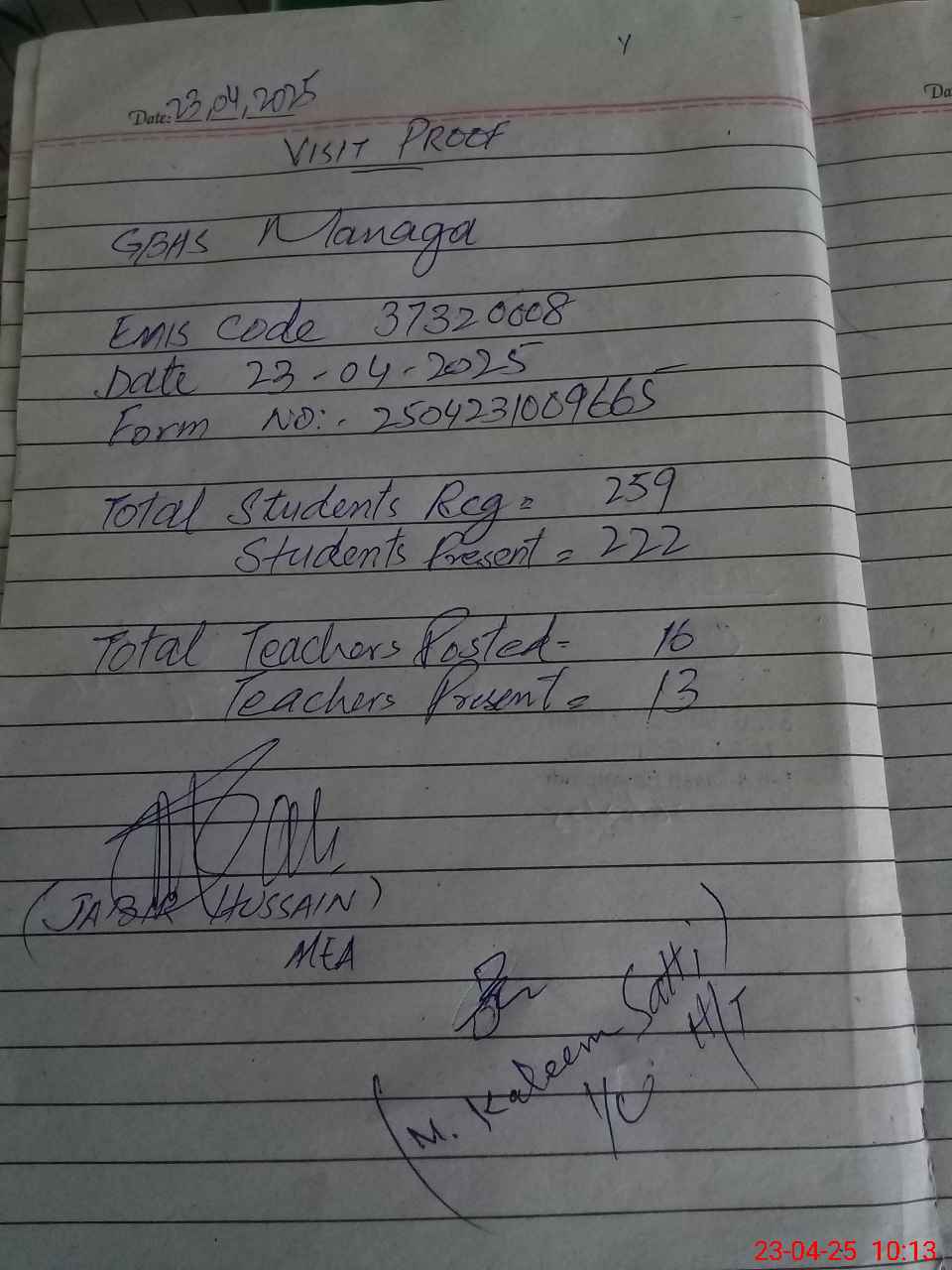 | Attendance Register | Head Teacher | MEA with School | Visit Proof |