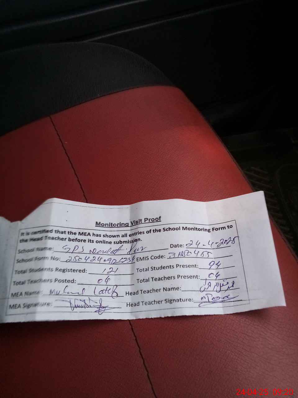 | Attendance Register | Head Teacher | MEA with School | Visit Proof |
