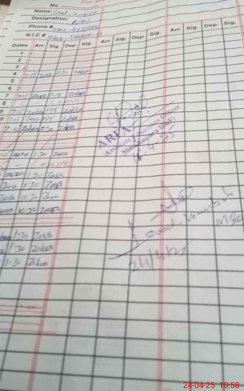 | CNIC | Full Name | Designation | R/C | Absence During Last Calender Month |