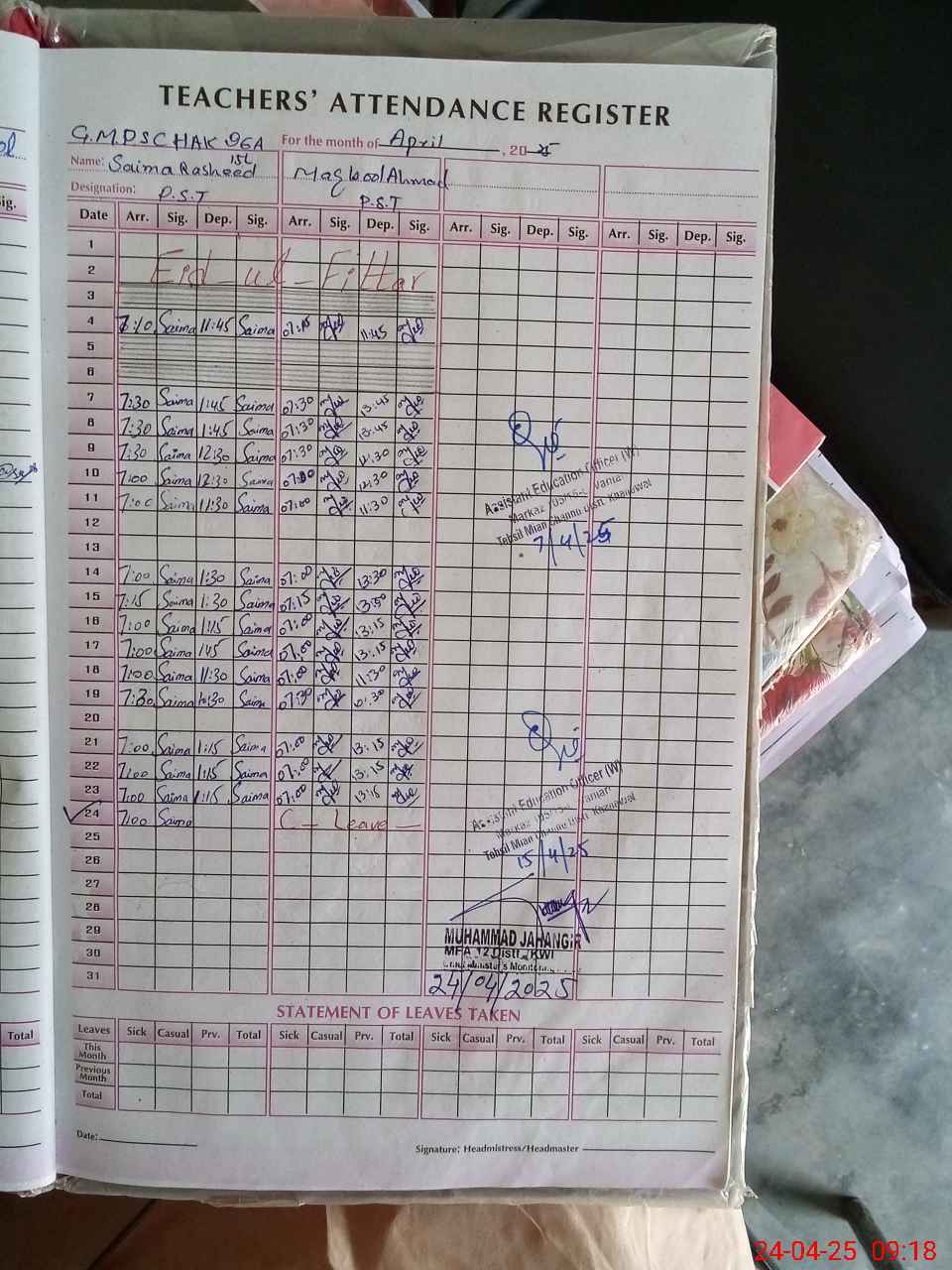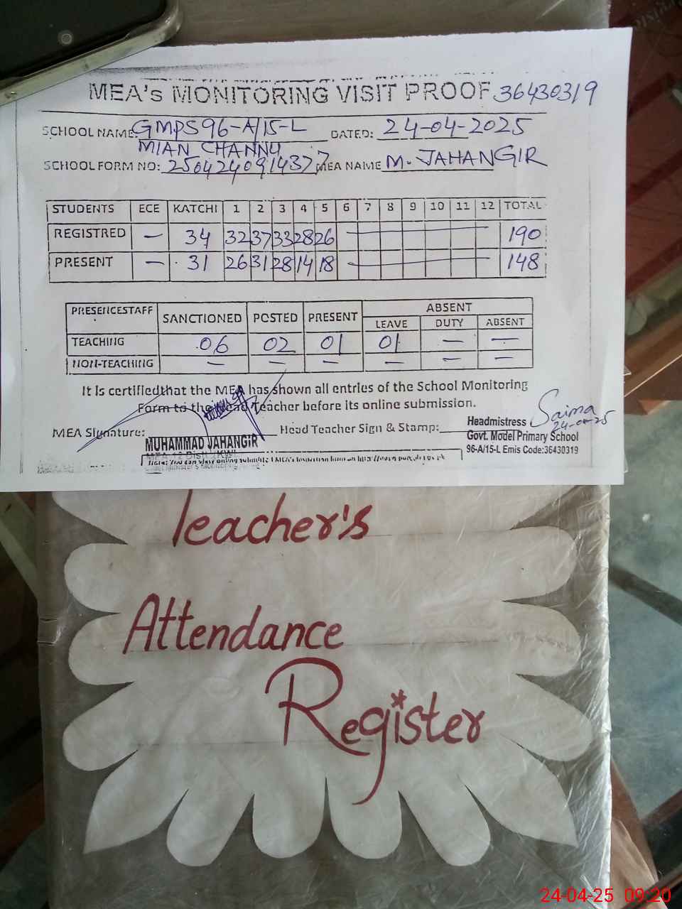 | Attendance Register | Head Teacher | MEA with School | Visit Proof |