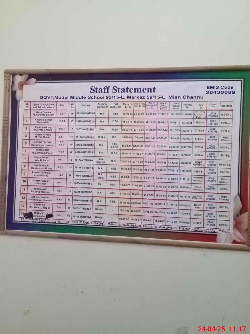 | EMIS Code: 36430089 | Name of School: GGHS MODEL 93/15-L, MIAN CHANNU | |||