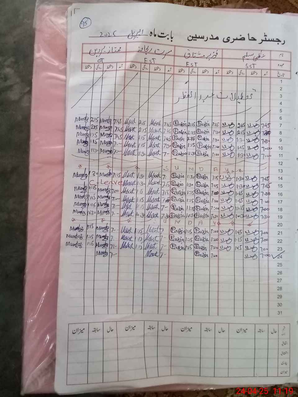 | CNIC | Full Name | Designation | R/C | Absence During Last Calender Month |