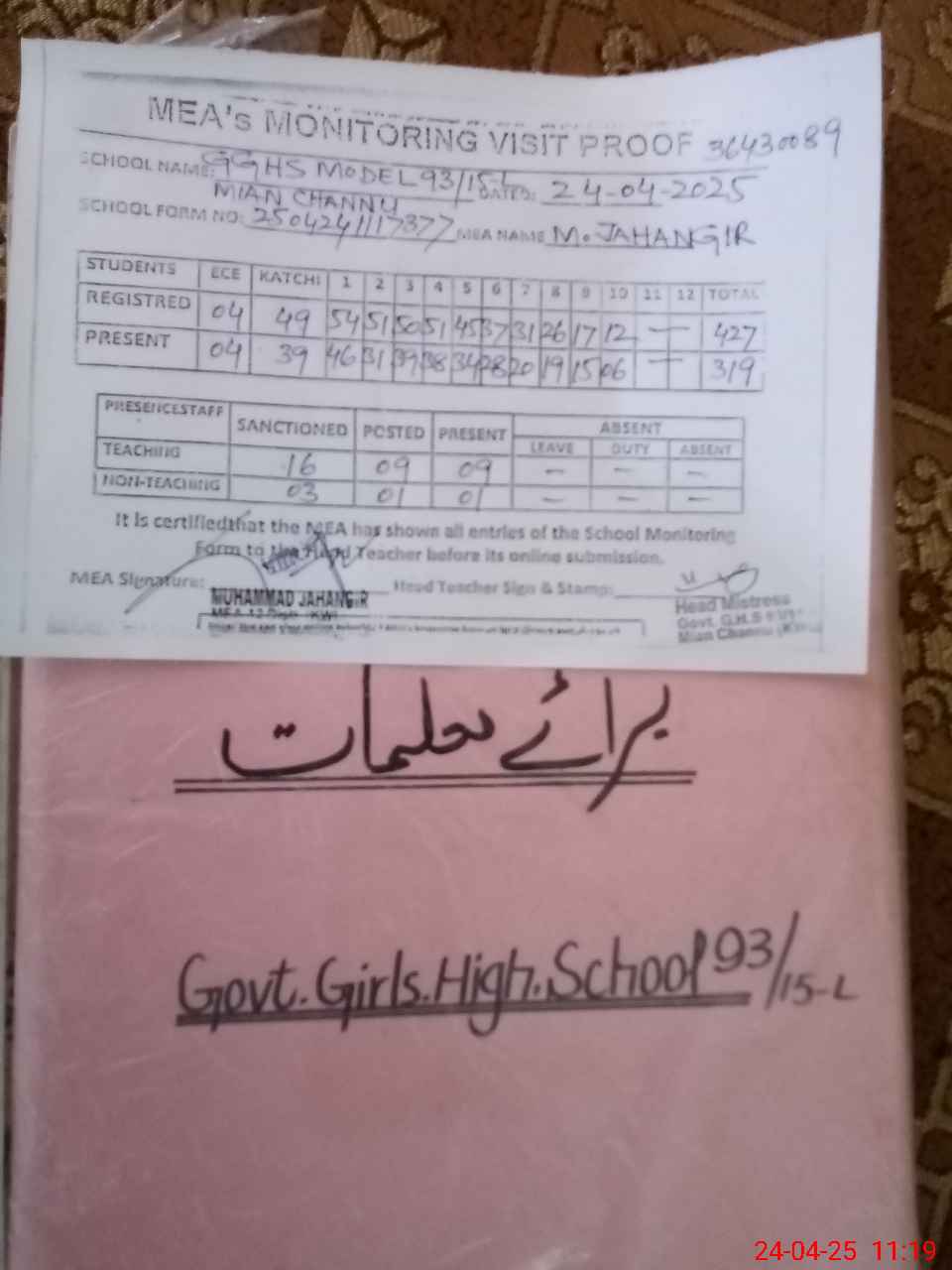 | Attendance Register | Head Teacher | MEA with School | Visit Proof |