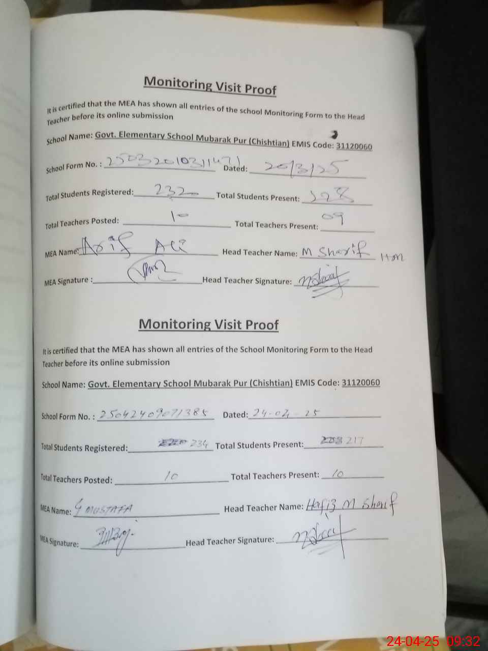 | Attendance Register | Head Teacher | MEA with School | Visit Proof |