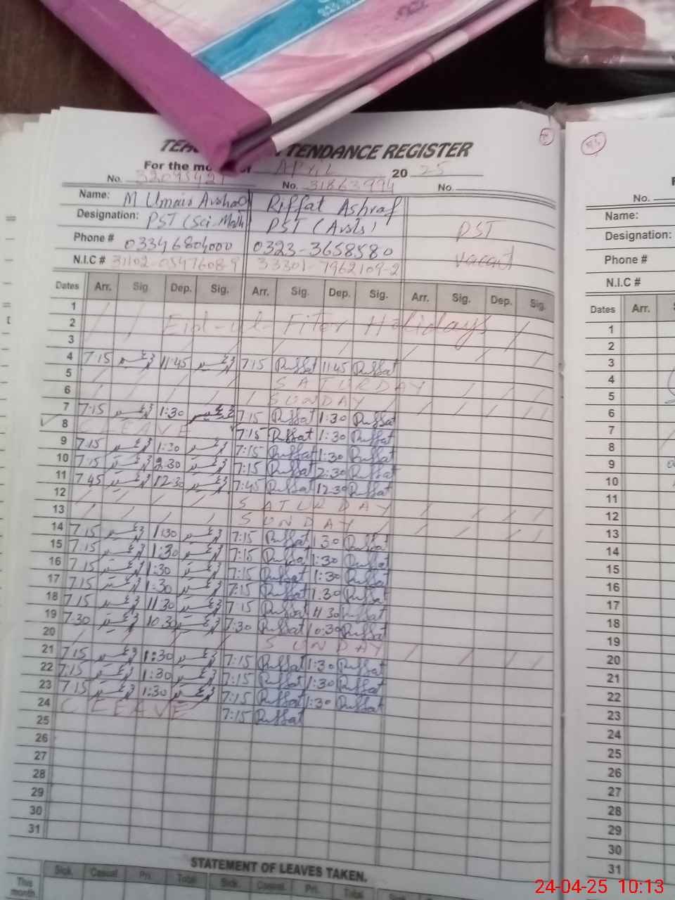 | CNIC | Full Name | Designation | R/C | Absence During Last Calender Month |
