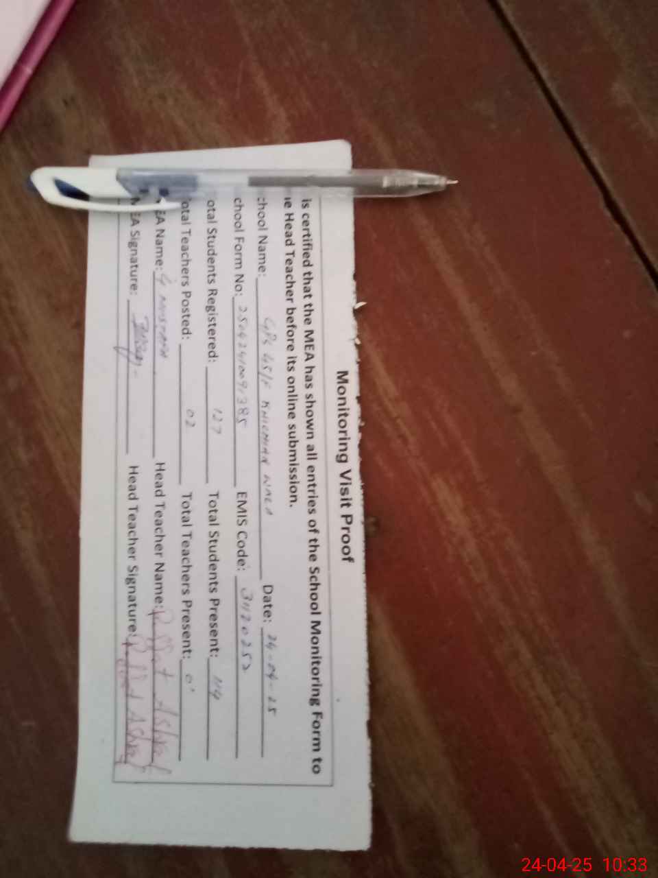 | Attendance Register | Head Teacher | MEA with School | Visit Proof |