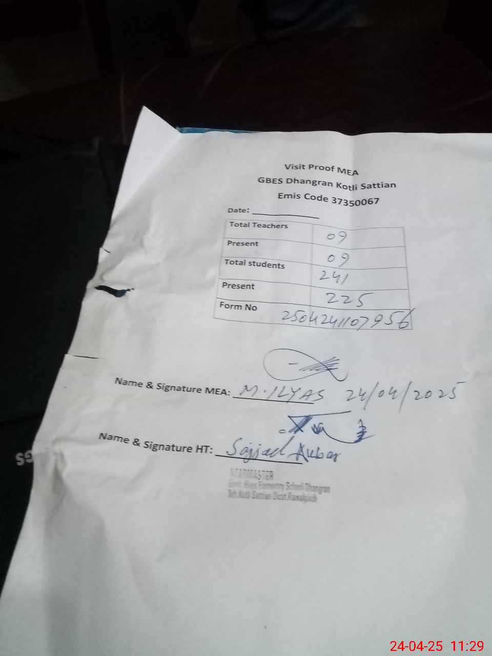 | Attendance Register | Head Teacher | MEA with School | Visit Proof |