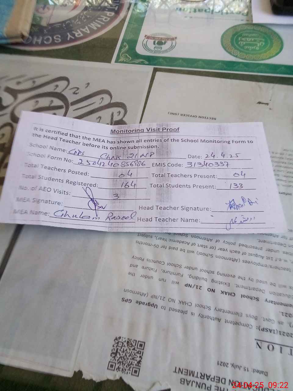| Certified that this School was Inspected by the Undersigned MEA/DMO Today and the Information Stated Above is as Per Record. | |||||