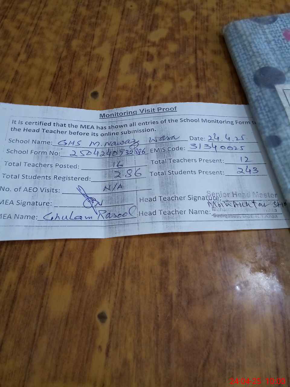 | Attendance Register | Head Teacher | MEA with School | Visit Proof |