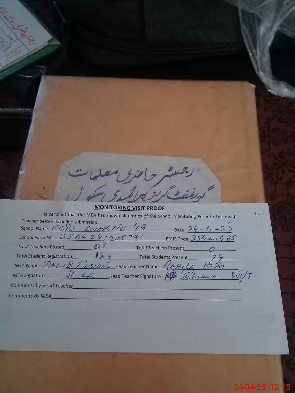 | Attendance Register | Head Teacher | MEA with School | Visit Proof |