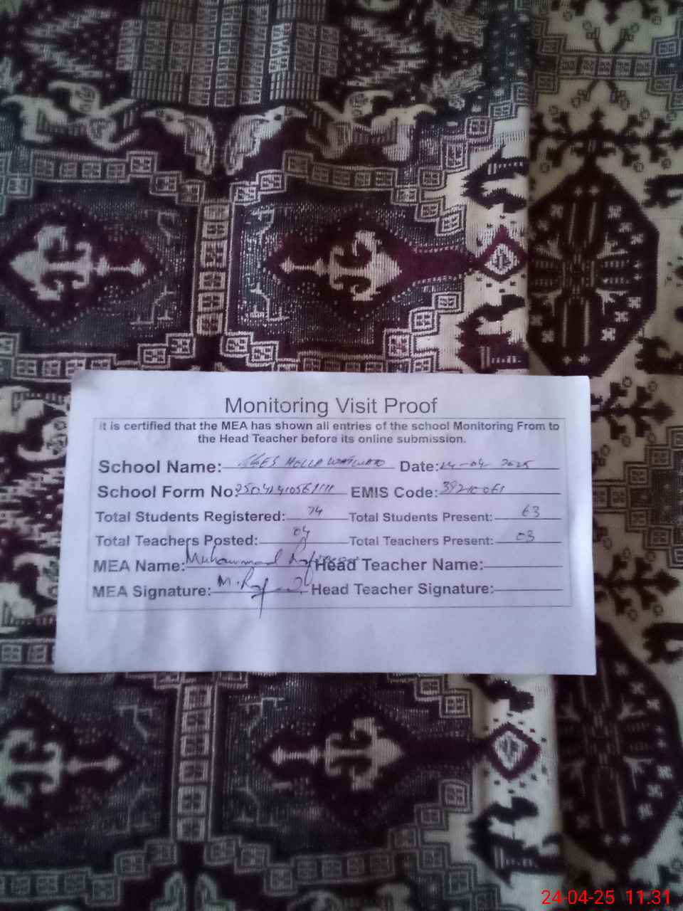 | Attendance Register | Head Teacher | MEA with School | Visit Proof |