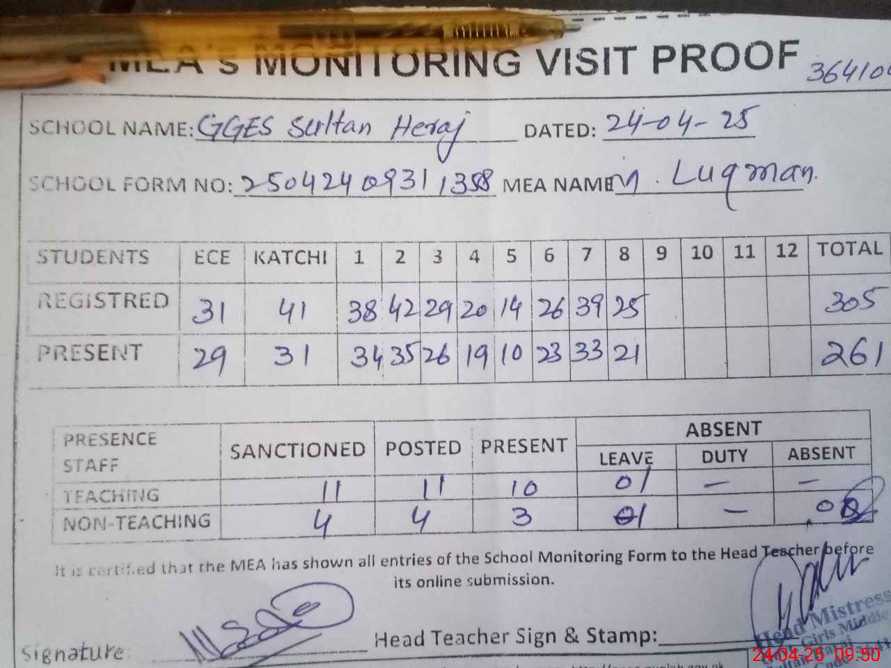 | Attendance Register | Head Teacher | MEA with School | Visit Proof |