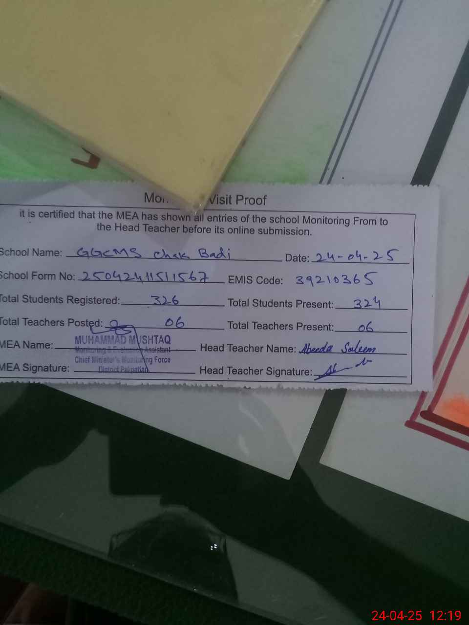 | EMIS Code: 39210365 | Name of School: GGCMS CHAK BEDI | |||