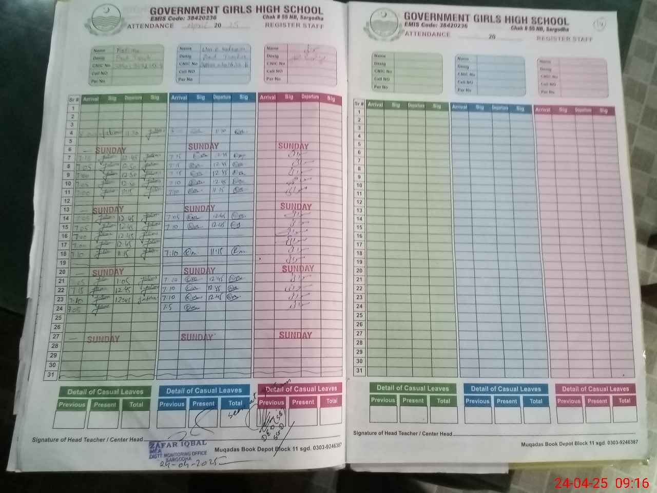 | CNIC | Full Name | Designation | R/C | Absence During Last Calender Month |