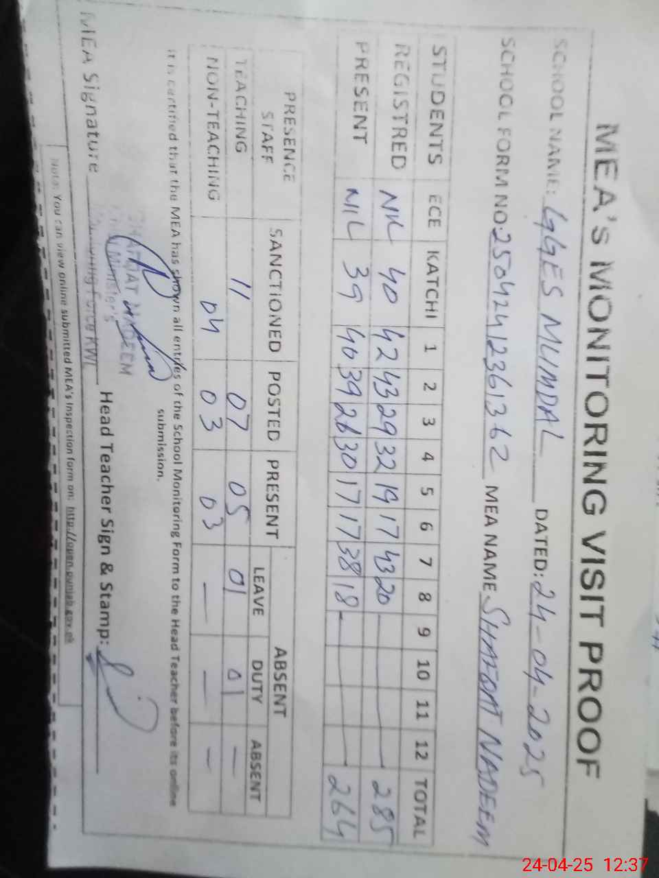 | Attendance Register | Head Teacher | MEA with School | Visit Proof |